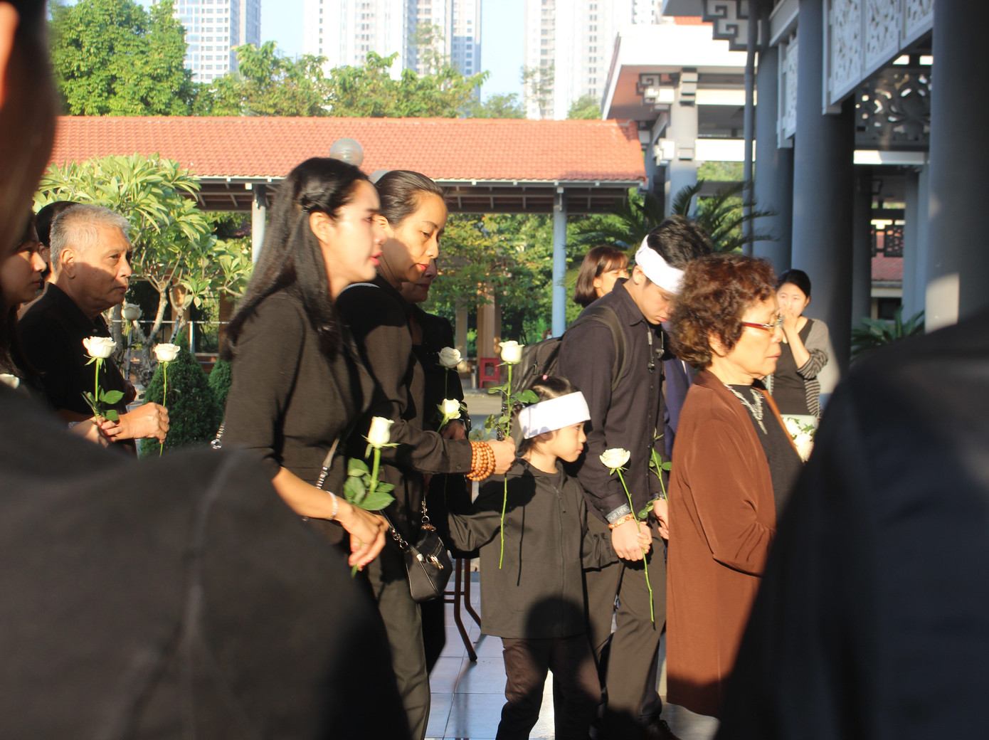 Lúc 7h sáng, vợ chồng nam đạo diễn cùng hai em của Hạnh An và những người thân trong gia đình cầm những cành hoa trắng đầu tiên tiến vào thắp hương cho cô bé.