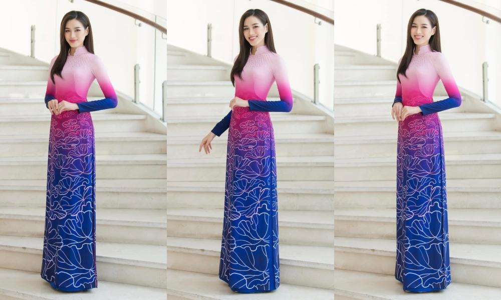 Thiết kế áo dài được Hoa hậu Đỗ Thị Hà chọn lần này lấy cảm hứng từ hoa sen, với phần thân trên mang sắc hồng nhạt của cánh hoa, rồi chuyển hồng đậm ở giữa thân, và phần tà như một cánh đồng hoa sen nhưng lại mang sắc xanh biếc.