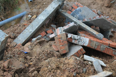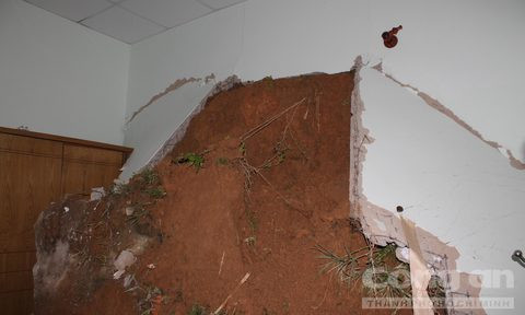 Khối đất lớn đổ xuống đã làm một số điểm nền nhà, gạch bị nứt, nhà kho bị sập hư hại nặng. Ngoài ra đất lấp gần hết phòng ngủ, riêng chiếc giường ngủ bị chôn vùi, chiếc tủ đựng đồ bên cạnh hư hỏng.