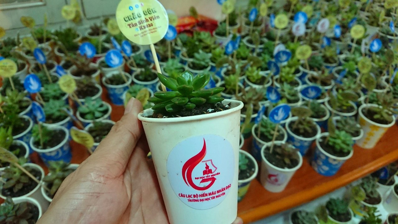 Sinh viên Phan Công Vinh, thành viên Ban chủ nhiệm CLB hiến máu nhân đạo Trường Đại học Tây Nguyên xếp ngay ngắn những chậu sen đá nhỏ xinh để ngày mai làm quà tặng cho những người hiến máu. Được biết, Vinh tham gia CLB hơn 1 năm, đã có 10 lần hiến máu đột xuất trực tiếp tại các bệnh viện trên địa bàn tỉnh. “Mỗi lần được hiến máu, tôi cảm thấy rất vui vì đã làm được một việc ý nghĩa. Tôi hình dung dòng máu của mình chảy trong người khác giúp họ được khỏe mạnh”, Vinh chia sẻ.