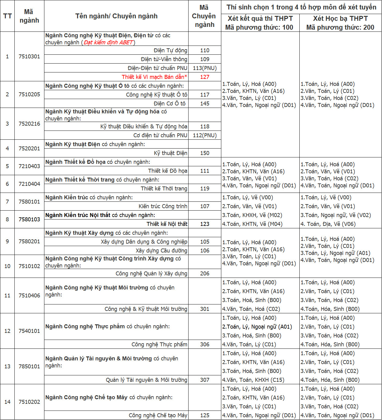 * Cơ điện tử chuẩn PNU (Chương trình Tiên tiến, hợp tác với ĐH Purdue, Mỹ).