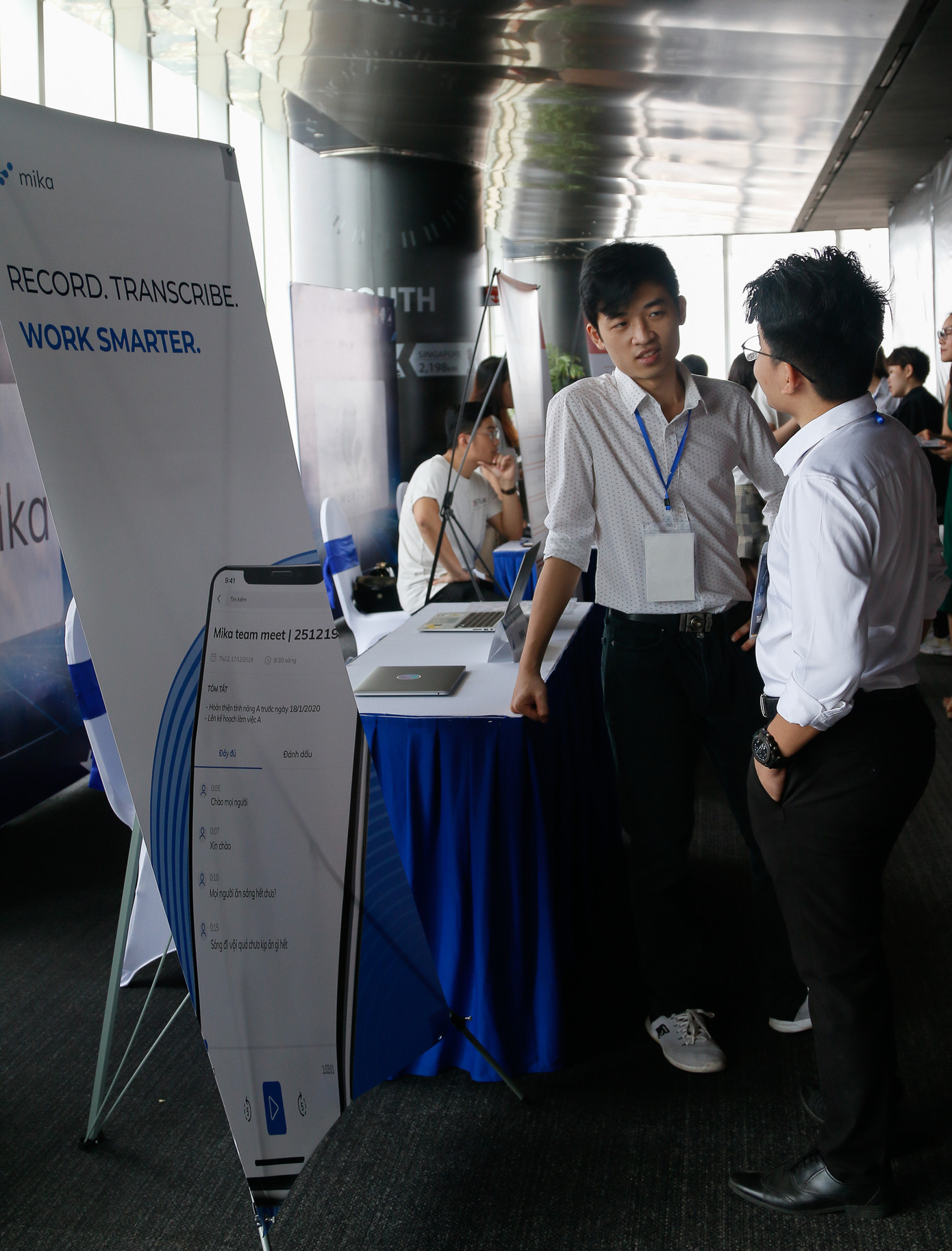 Tại khu vực sân khấu, các đội chơi tham gia phần trình bày đề án và sản phẩm demo tới khách hàng và nhà đầu tư