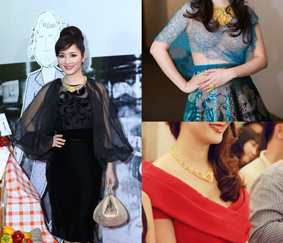 Giáng My cũng rất mê sưu tầm trang sức. Trong một sự kiện, chị diện vòng cổ lấp lánh trị giá 700 triệu đồng (bên trái). Một số lần xuất hiện khác, người đẹp này chơi sang diện bộ trang sức có giá đến 1 tỷ đồng (bên phải).