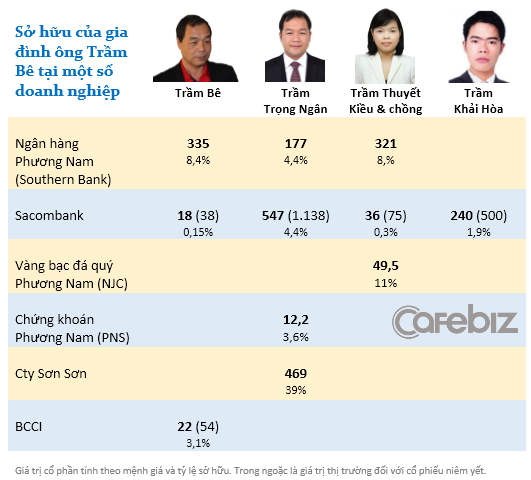 Còn tại Ngân hàng Phương Nam, ông Bê và gia đình đang nắm giữ hơn 83 triệu cổ phiếu, tương đương 20,8% cổ phần. Con trai cả Trầm Trọng Ngân thay ông Bê giữ chức vụ Phó chủ tịch Thường trực và con gái Trầm Thuyết Kiều giữ vị trí Phó Tổng giám đốc.