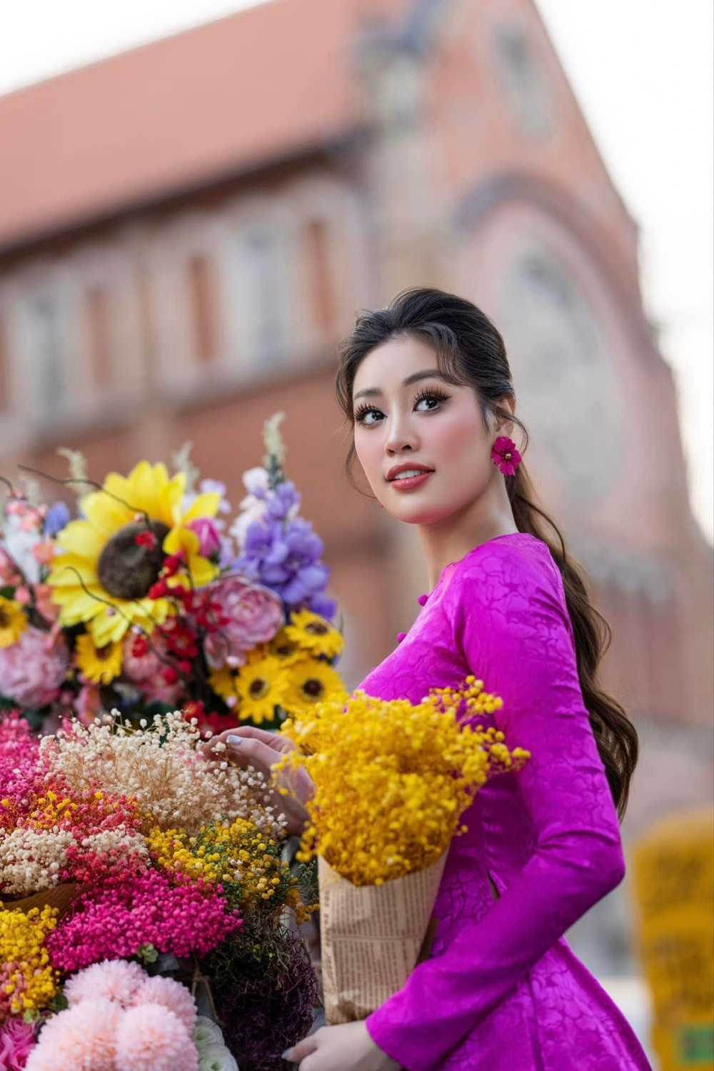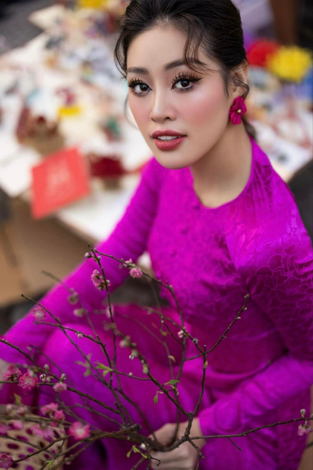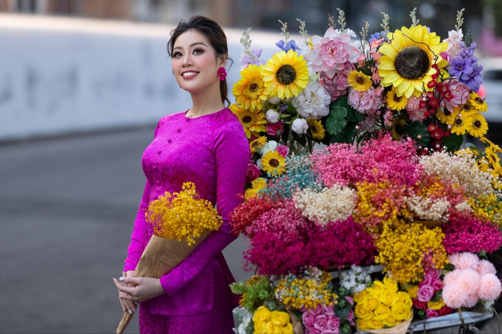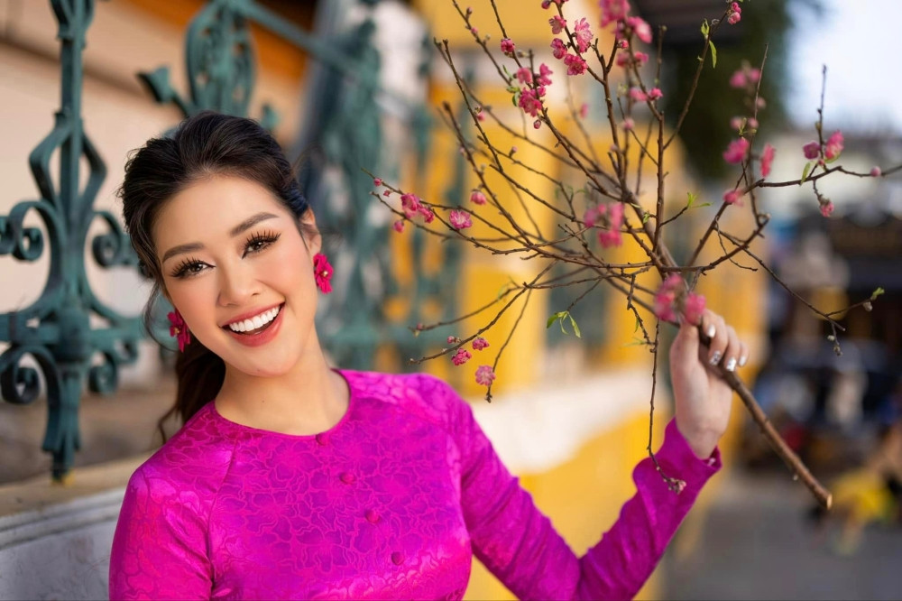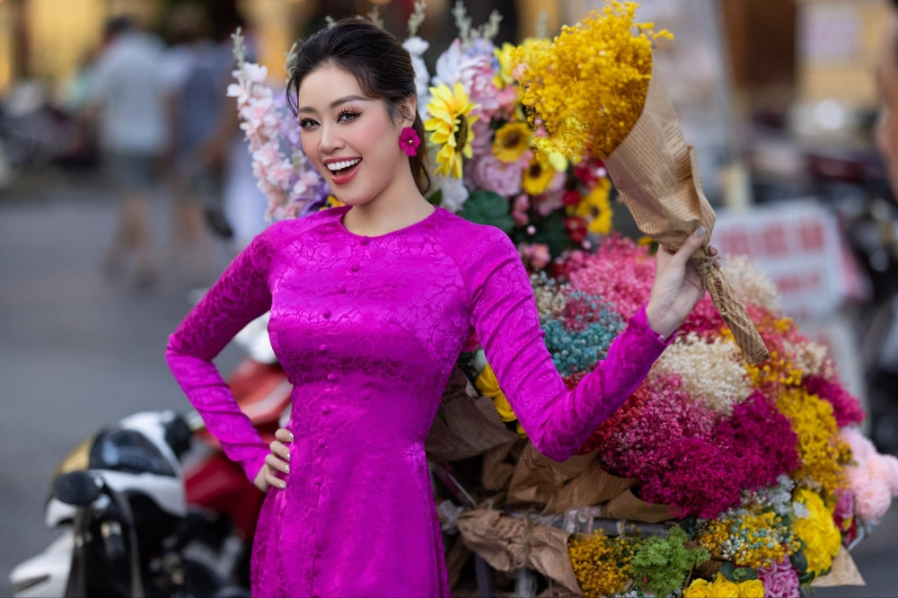 Trong bộ ảnh chào đón Tết Nguyên đán Giáp Thìn 2024 sắp đến, Khánh Vân đã chọn mặc áo bà bà, thay vì mặc áo dài như nhiều người đẹp khác. Nàng hậu chọn bộ áo bà ba màu hồng đậm, khoe nhan sắc rực rỡ giữa đường phố TP.HCM.
