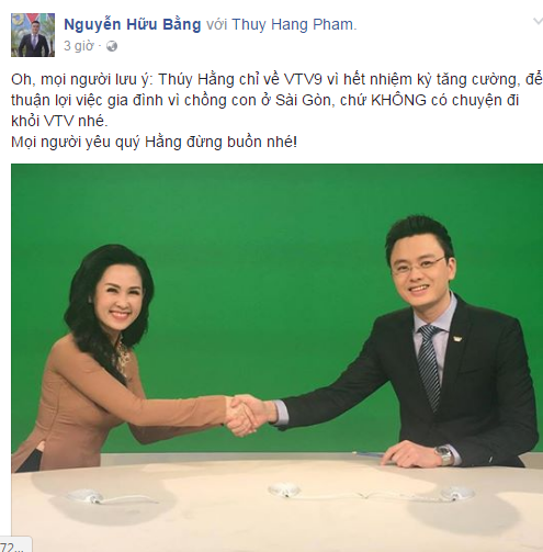 Mới đây, BTV Hữu Bằng đã lên tiếng giải thích về việc không có chuyện BTV Thúy Hằng rời VTV. Mà sự thật là “Thúy Hằng chỉ về VTV9 vì hết nhiệm kỳ tăng cường, để thuận lợi việc gia đình vì chồng con ở Sài Gòn, chứ không có chuyện đi khỏi VTV”- Hữu Bằng viết.