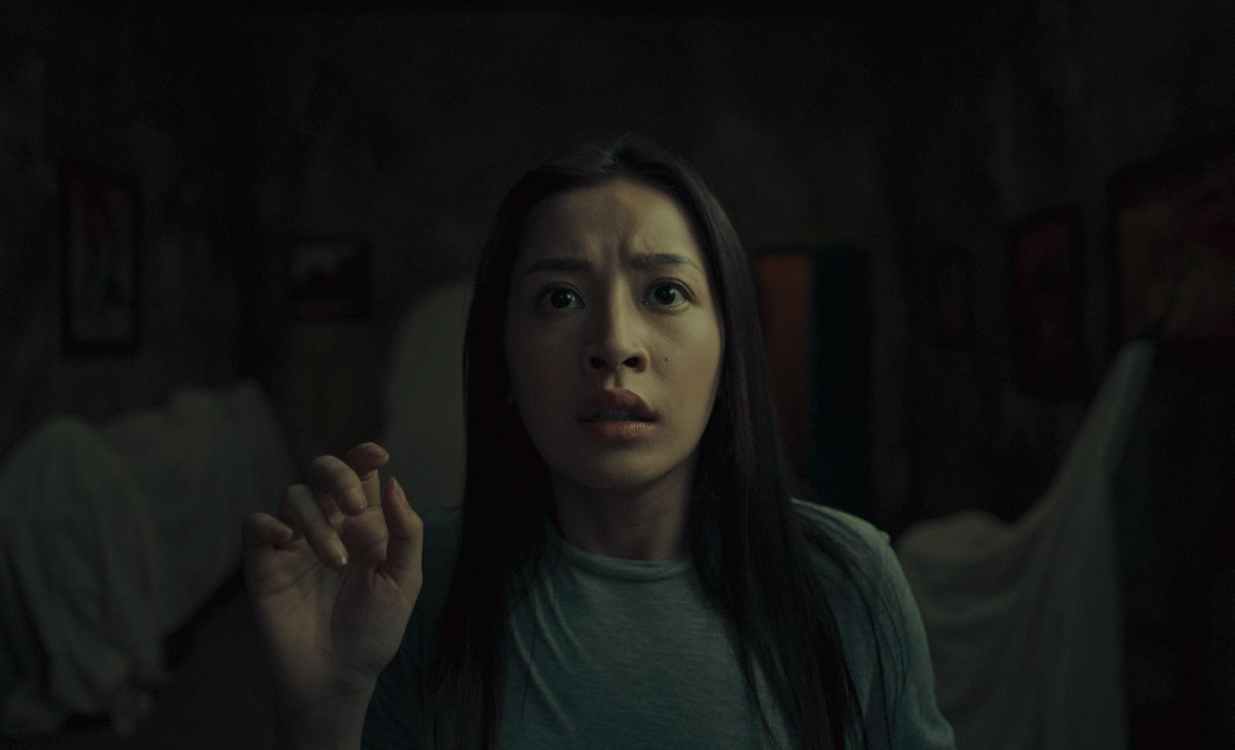 Cô bị trói chặt vào một chiếc ghế, như đang trong nghi thức của một buổi trừ tà. Bộ áo dài vương máu, những ngón tay co quắp của Linh cho thấy sự dữ dội của lễ trục vong, trong khi gương mặt của nhân vật vừa đau khổ vừa bí hiểm. Phía sau Linh là bức tranh của Mười (Anh Thư) với nụ cười ma mị.