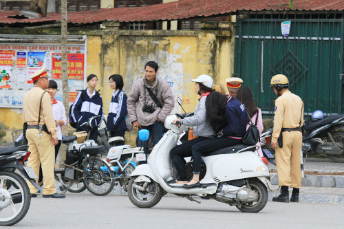 Mặc dù mang theo mũ bảo hiểm, nhưng nhóm nữ sinh này chỉ nghiêm chỉnh chấp hành luật khi nhìn thấy cảnh sát giao thông.