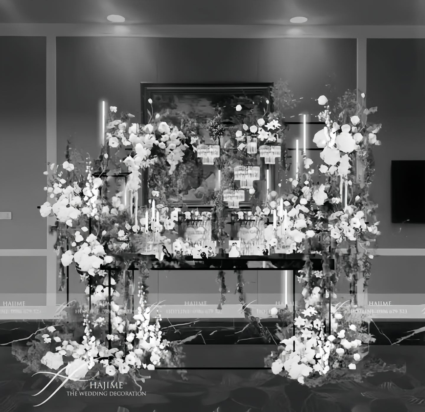 Dù đây mới chỉ là bản thiết kế 3D và ảnh đen trắng nhưng không khó để nhận thấy bối cảnh cực kỳ hoành tráng đã được chuẩn bị. Ngoài hoa tươi trang trí, ảnh cưới của cặp đôi cũng phóng khổ lớn và trưng bày ở sảnh khách sạn. Với những hình ảnh được tiết lộ này, cư dân mạng cũng vô cùng "ngóng" được xem bối cảnh hoàn thiện chứ không riêng gì 2 nhân vật chính.