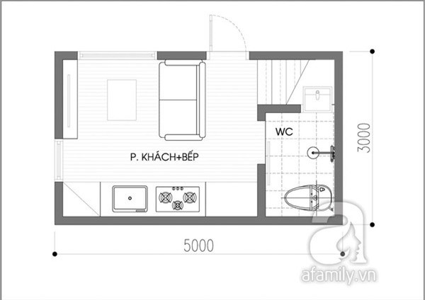 Mặt bằng tư vấn tầng 1. Mặt bằng tư vấn tầng lửng. Ngôi nhà có diện tích khá khiêm tốn: 3x5 mét. Tuy nhiên không gian này lại có lợi thế là khuôn phòng vuông vức nên việc bố trí nội thất hợp lý không khó. Ngoài ra các không gian chức năng cũng dễ được tiếp cận với ánh sáng từ trước nhà. Với tầng trệt, từ lối đi vào, bên trái sẽ là khu vực cầu thang và nhà vệ sinh. Bạn nên sử dụng hình thức thang cuốn sắt mặt bậc gỗ và lan can kính để tăng giá trị về mặt thẩm mỹ và tiết kiệm diện tích cho căn nhà nhỏ. Một chiếc chậu rửa nhỏ xinh sẽ được bố trí khéo léo dưới gầm thang. Ghế sofa được kê sát cửa sổ lớn nhìn ra không gian bên ngoài. Đối diện sẽ là hệ thống tủ bếp kết hợp tủ đa năng có khả năng lưu trữ lớn.Tầng lửng được cơ cấu thành một phòng ngủ nhỏ gồm có 1 giường ngủ kê sát tường, tivi được bố trí phía đối diện và một tủ quần áo 3 buồng bên cạnh. Với căn nhà nhỏ, bạn nên chọn các gam màu sáng và trắng làm màu cơ bản. Bạn cũng có thể sử dụng một số màu sắc nổi bật như xanh, tím, vàng… để làm điểm nhấn cho căn nhà. Giấy dán tường cho phòng khách và phòng ngủ với họa tiết nhẹ nhàng là gợi ý hay cho việc trang trí nội thất nhà bạn. Việc lựa chọn đồ nội thất trong căn phòng phải được ưu tiên tính tiện dụng, gọn, nhẹ lên hàng đầu. Sau đây là một số hình ảnh minh họa giúp bạn hình dung được tốt nhất về không gian cho ngôi nhà. Cầu thang thép gỗ dạng đứng giúp tiết kiệm diện tích. Phòng khách nhỏ gọn với sofa màu sáng và các đôn nhỏ. Hệ tủ tivi đa năng tiện dụng và có tính thẩm mỹ. Phòng ngủ trên tầng lửng với trần thấp nhưng không gian thoáng. Vệ sinh nhỏ với thiết bị gọn tối đa.