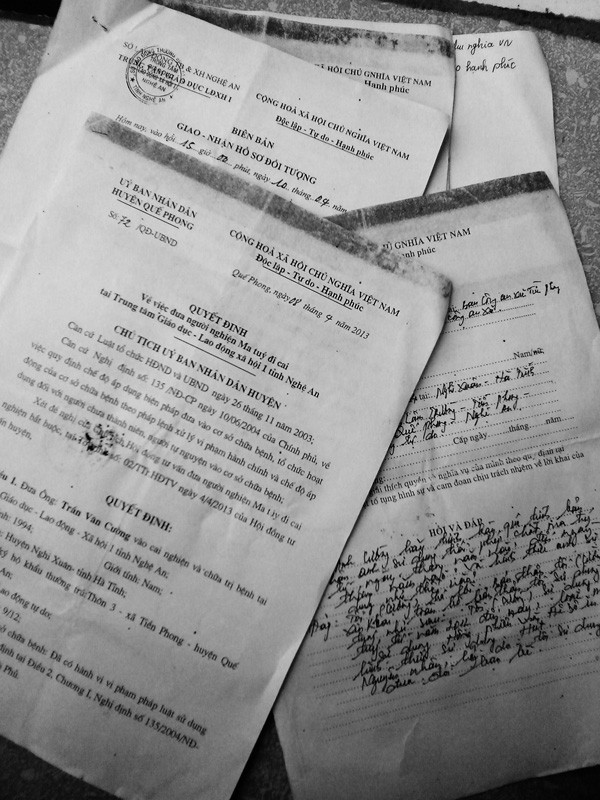 Biên bản giao nhận hồ sơ được lập ngày 10/4/2013, giữa Công an huyện Quế Phong và TTGDLĐXHI. Tuy nhiên, khi chúng tôi đưa hồ sơ hỏi Trần Văn Cường thì Cường khẳng định anh không hề viết hay ký bất kỳ một chữ nào trong tập hồ sơ đó. Khi chúng tôi trực tiếp gặp một số cán bộ của TTGDLĐXHI, là những người trực tiếp làm công tác cai nghiện cho Cường, thì mọi người đều khẳng định, từ khi được đưa vào trung tâm đến nay, Cường không hề có dấu hiệu đã sử dụng chất ma túy.