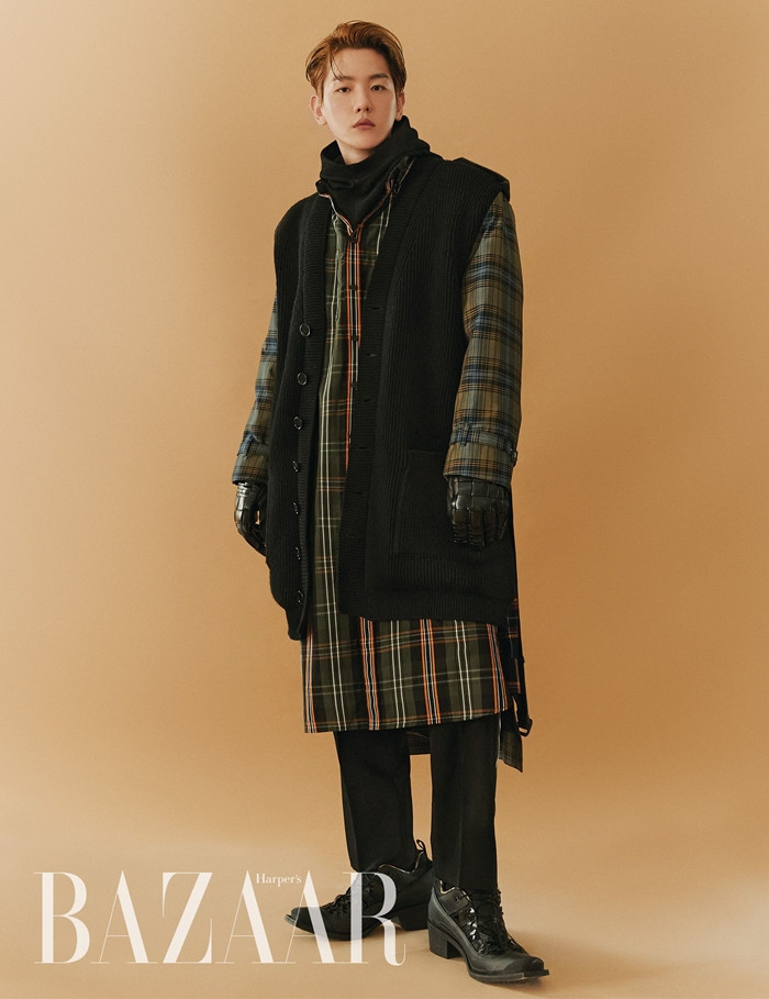 Trên bìa tạp chí Harper’s Bazaar Hàn số tháng 10, dường như BURBERRY còn mua nguyên quảng cáo cả trang bìa, vì chữ BAZAAR tên của tạp chí còn được in với họa tiết kẻ đặc trưng của BURBERRY. Baekhyun đứng cạnh một chữ B hoa (viết tắt của tên hãng) và đương nhiên là anh mặc nguyên set đồ nằm trong BST Thu Đông 2020 mới nhất của thương hiệu này.