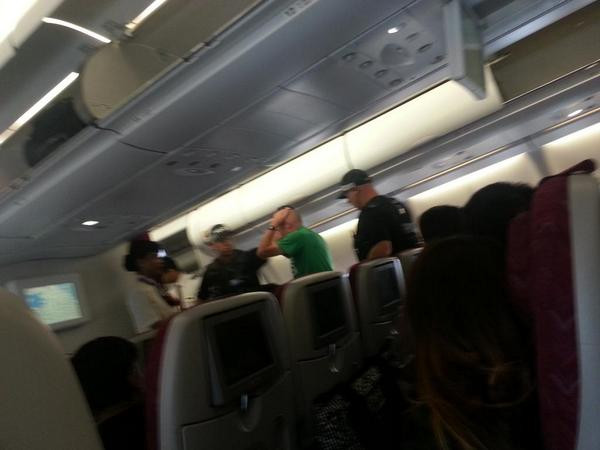 Một người dùng Twitter đã cho đăng tải bức ảnh người đàn ông mặc áo xanh giơ hai tay lên đầu, bị áp giải ra khỏi máy bay.