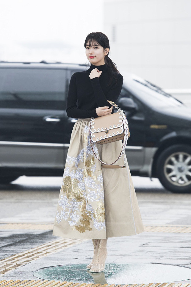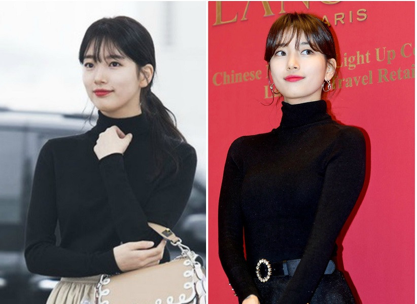Có một điều thú vị là khán giả nhận ra Suzy ăn mặc, trang điểm và làm tóc gần như giống hệt một lần ra sân bay vào tháng 2/2017, nghĩa là cách đây tròn ba năm. Suzy khi ấy cũng buộc tóc trễ, mặc áo len cao cổ màu đen đi kèm chân váy xòe dài ngang bắp chân.