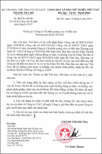 Công văn cũng ghi rõ: "Sau khi xem xét các trang điện tử, báo mạng và báo viết đưa nhiều thông tin về việc Triệu Thị Hà có những phát ngôn không đúng sự thật, vu khống xúc phạm nhân phẩm, danh dự của bà Hồng và BTC, Thanh tra Bộ VH-TT&DL đề nghị bà Hồng và công ty gửi đơn đến Bộ Thông tin - Truyền thông xem xét, xử lý hoặc khởi kiện Triệu Thị Hà ra tòa.