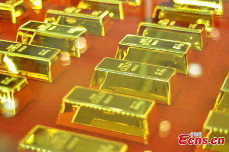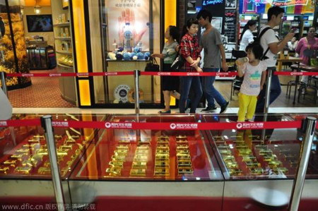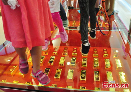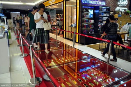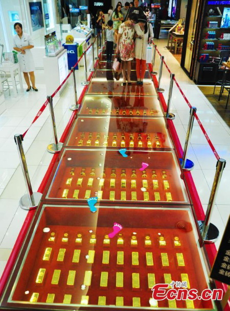 Rất đông người mua sắm tới một trung tâm thương mại quốc tế tại Yichang, tỉnh Hồ Bắc của Trung Quốc những ngày này đang bị thu hút bởi một con đường bằng vàng ròng sáng rực.