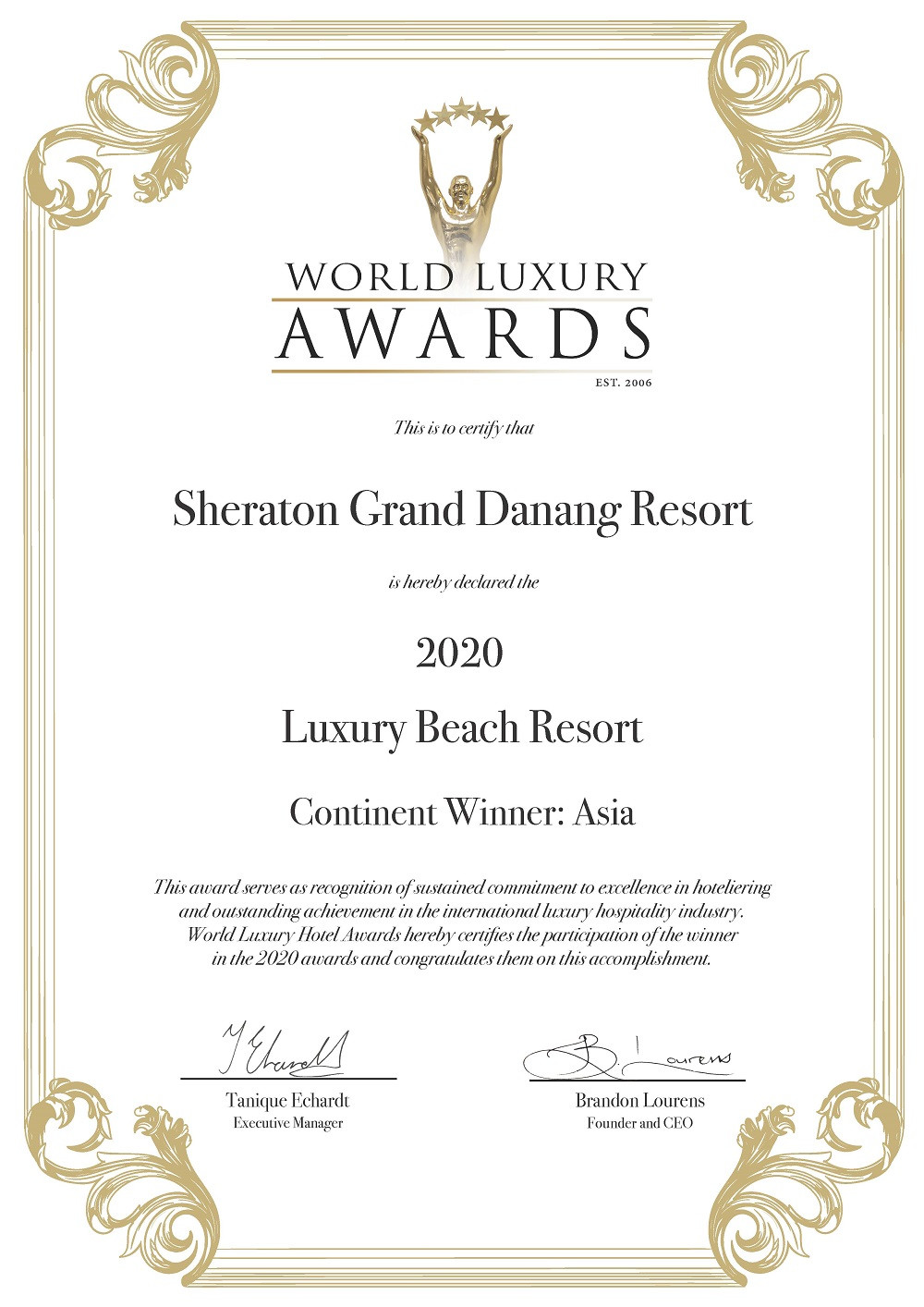 Khu Nghỉ Dưỡng Sheraton Grand Đà Nẵng nhận giải thưởng World Luxury Hotel Awards 2020