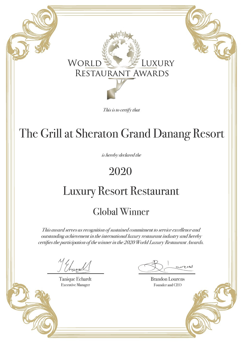 Khu Nghỉ Dưỡng Sheraton Grand Đà Nẵng vinh dự nhận giải thưởng World Luxury Hotel Awards 2020, M&C Asia Stella Awards 2020 và nhà hàng The Grill thuộc khu nghỉ dưỡng được vinh danh tại 2020 World Luxury Restaurant Awards