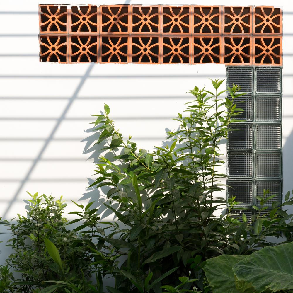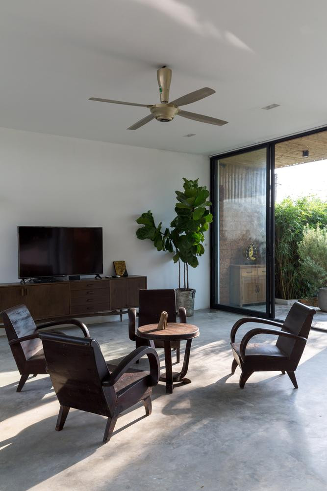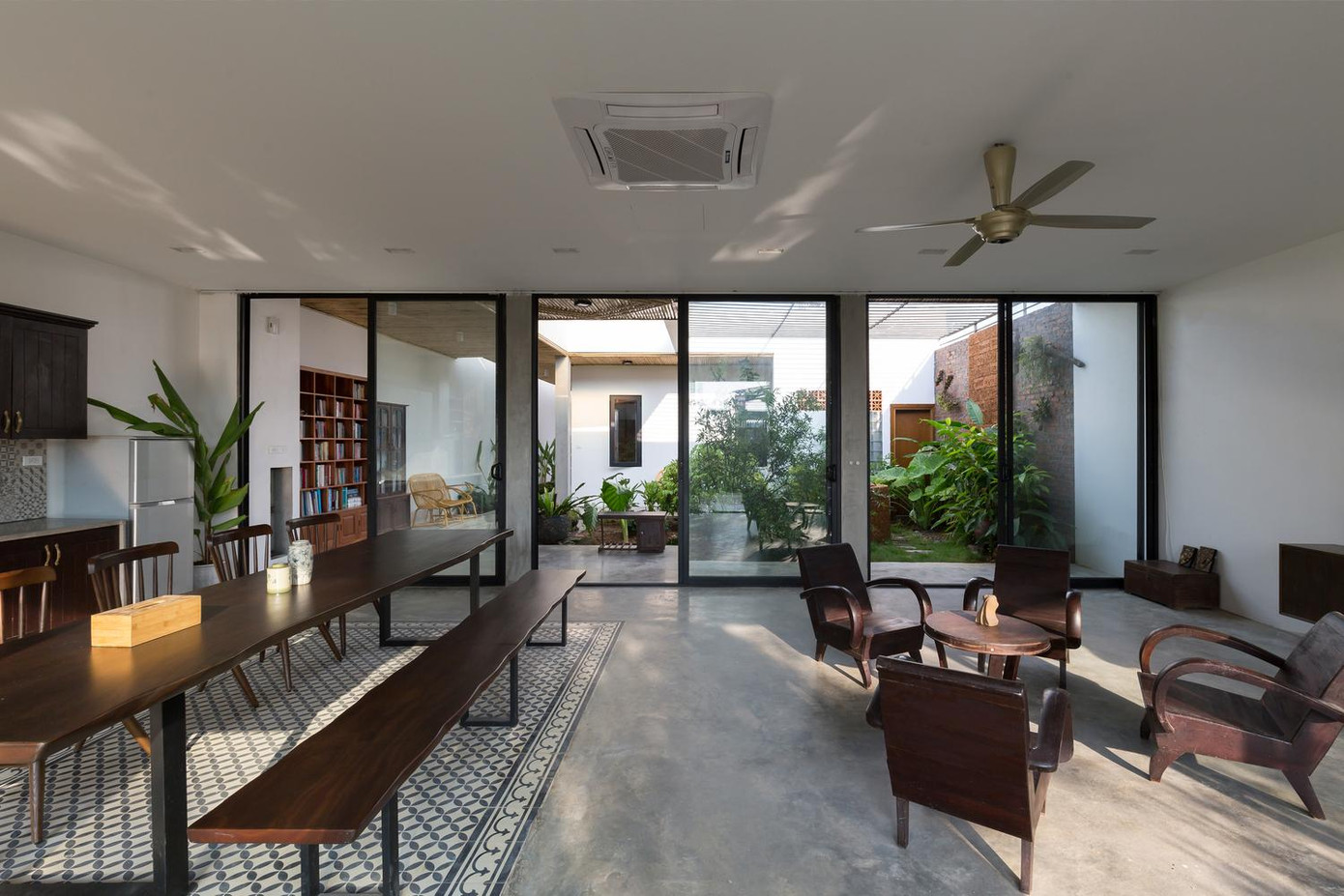 | Về tổng thể, đây là một căn nhà mái bằng được chia làm 3 phần.  | | Khu vực đầu tiên gồm phòng khách, bàn ăn và bếp. |  | | khu vực 2 gồm nhà vệ sinh, nhà kho, phòng ngủ lớn; khu vực 3 gồm phòng ngủ nhỏ, kho để đồ và nhà vệ sinh. |  | | Các khu vực được kết nối với nhau thông qua lối đi nhỏ được lát tre trên trần. |  | | Phần chuyển tiếp giữa mỗi khu vực là khoảng sân vườn trồng hoa, cây cảnh và có cả giếng. |  | | Từ các khu vườn lộ thiên này, ánh sáng và không khí trong nhà được lưu thông, tạo sinh khí cho người ở. |  | | Nhà vệ sinh có lớp gạch thông gió phía trên để không khí được lưu thông. |  | | Các cánh cửa trong nhà đều làm bằng kính trong suốt để tạo không gian đa chiều cho ngôi nhà, nhất là lúc nắng sớm hoặc khi hoàng hôn. |  | | Nội thất trong nhà hầu hết là đồ gỗ màu nâu đen, đem lại cảm giác ấm cúng và yên tĩnh cho những người sinh sống trong nhà. | |