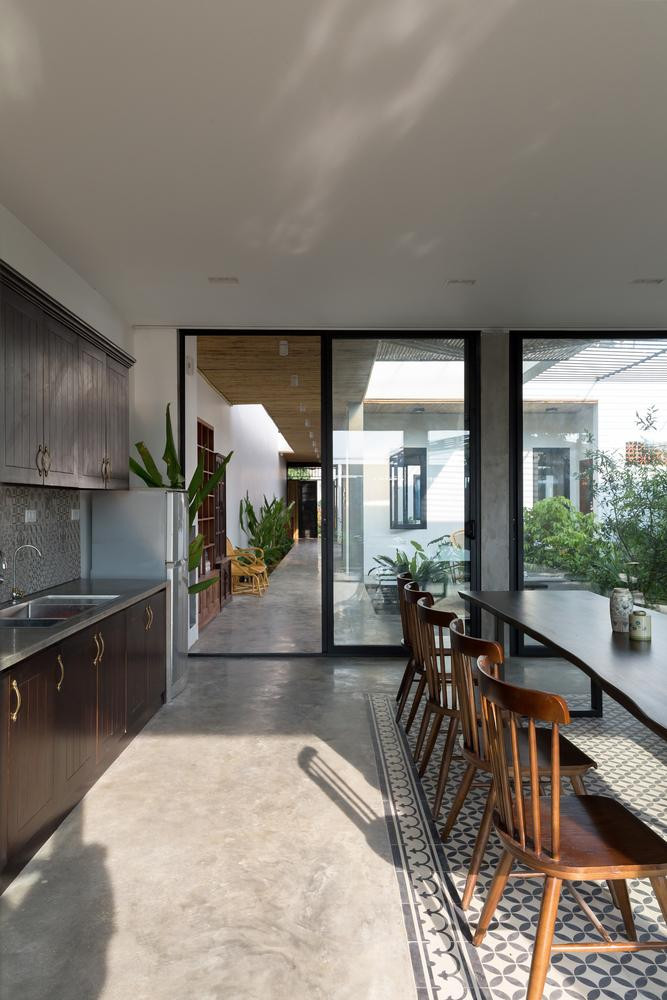 TPO - Các khu vực được kết nối với nhau thông qua lối đi nhỏ được lát tre trên trần, phần chuyển tiếp giữa mỗi không gian là khoảng sân vườn trồng hoa, cây cảnh và có cả giếng.