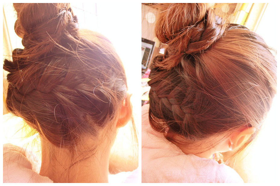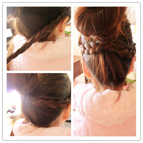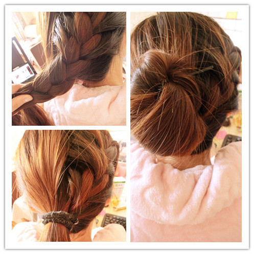 Phần tóc hai bên tết ba đơn giản. Sau khi tết xong bạn quấn vào cùng với phần búi ở giữa, cuốn từ dưới vòng lên cho đến hết phần đuôi tết rồi dùng ghim cố định tóc, làm tương tự với phần tóc bên kia.