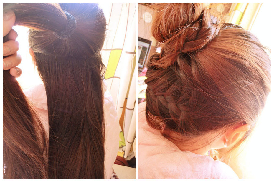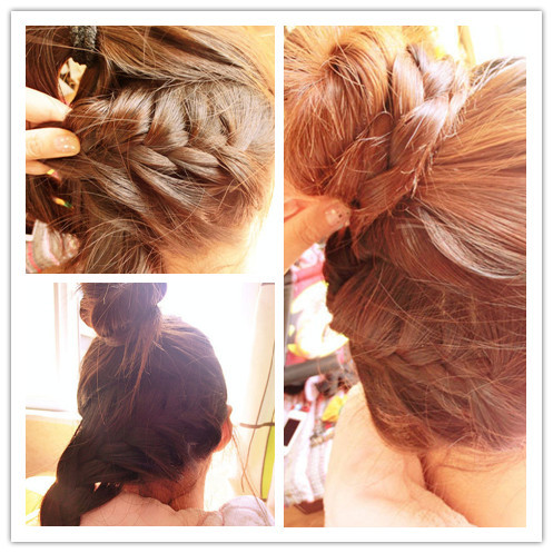 Chia tóc thành hai phần trên - dưới. Nửa trên búi cao lên rồi cột chặt lại, nửa dưới tết xương cá đến hết đuôi tóc rồi cuộn tròn lại theo phần tóc búi ở trên.