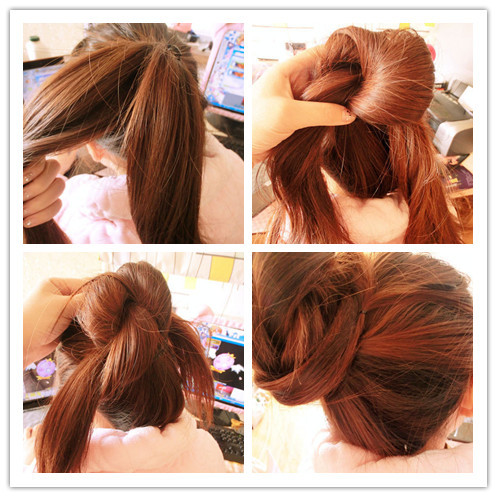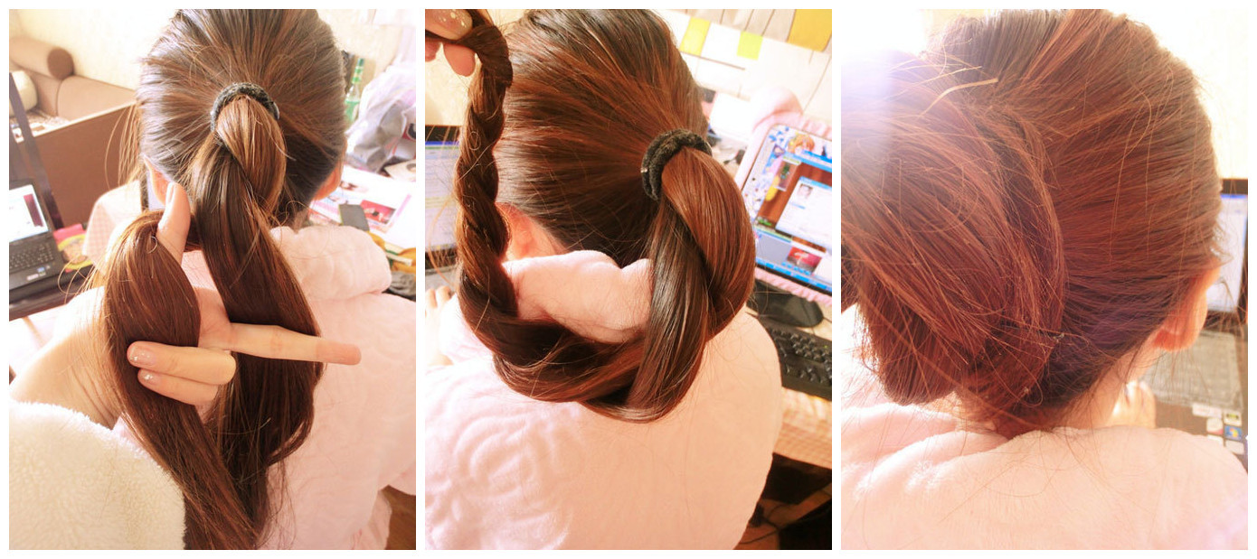 Buộc tóc đuôi ngựa, chia tóc làm hai phần và vặn tóc từ trên xuống dưới rồi búi tròn lại, dùng kẹp ghim để cố định tóc lại.
