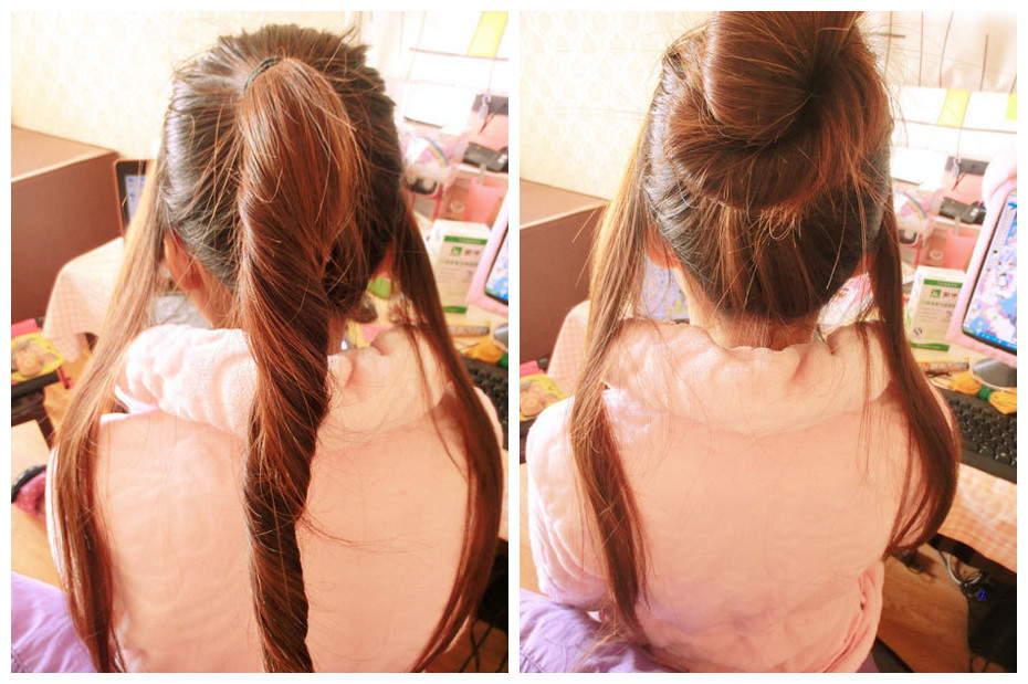 Vẫn buộc tóc đuôi ngựa, chia tóc thành hai phần rồi lồng hai phần tóc vào với nhau. Phần tóc còn thừa bạn quấn tròn lại, dùng kẹp ghim cố định lại.