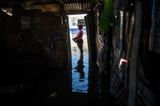 Người phụ nữ đứng ngoài cửa nhà, giữa biển nước lũ ở khu ổ chuột El Indio, ngoại ô Piura, miền bắc Peru.