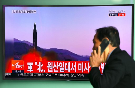 Một người đàn ông ở Seoul, Hàn Quốc, đi qua màn hình đưa tin về vụ Triều Tiên thử tên lửa. Triều Tiên thử tên lừa hôm 22/3 nhưng đã thất bại. Vụ việc diễn ra chỉ 2 tuần sau khi nước này phóng thử 4 tên lửa, trong đó 3 quả rơi xuống vùng đặc quyền kinh tế Nhật Bản.