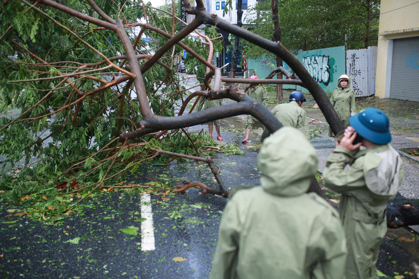 Dọc đường 30/4, TP Đà Nẵng, cây đổ la liệt, cơ quan chức năng đã có mặt để cắt tỉa, khắc phục sự cố, mở lối di chuyển cho các phương tiện giao thông.