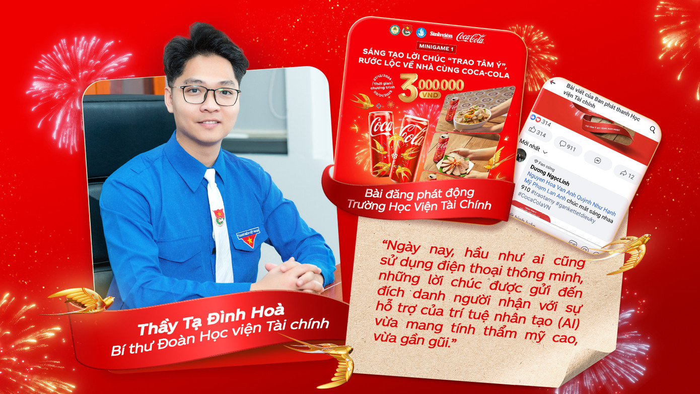 Anh Tạ Đình Hoà, Bí thư Đoàn Học viện Tài chính, chia sẻ: “Tết là cơ hội để các bạn sinh viên sum họp với gia đình sau một năm học tập chăm chỉ. Sẽ càng có ý nghĩa hơn nếu trong dịp đặc biệt này sinh viên có thêm nhiều kênh để thể hiện tình cảm với người thân phù hợp với bối cảnh hiện tại. Ngày nay, hầu như ai cũng sử dụng điện thoại thông minh, những lời chúc được gửi đến đích danh người nhận với sự hỗ trợ của trí tuệ nhân tạo (AI) vừa mang tính thẩm mỹ cao, vừa gần gũi. Sinh viên Học viện tài chính rất hào hứng với chương trình. Cảm ơn Báo Tiền Phong và Coca-Cola đã mang đến cho các bạn sinh viên một chương trình ý nghĩa”.