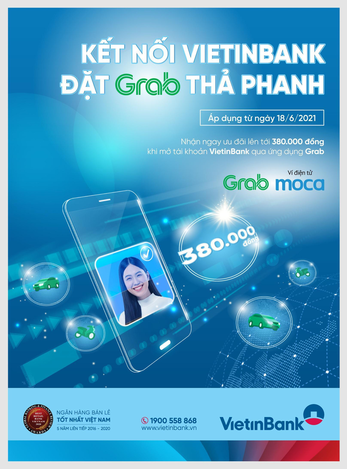 Không ngừng đổi mới, đẩy mạnh ứng dụng công nghệ trong cuộc sống nhằm mang lại sự thuận tiện, giá trị tốt nhất đến với khách hàng, VietinBank hợp tác với Grab/Moca triển khai Chương trình khuyến mãi “Kết nối VietinBank, đặt Grab thả phanh”. Theo đó, từ ngày 18/6/2021, khách hàng thực hiện mở mới tài khoản thanh toán của VietinBank trực tuyến từ ứng dụng Grab và liên kết với giải pháp thanh toán di động Moca thành công sẽ nhận được ưu đãi đặc biệt: