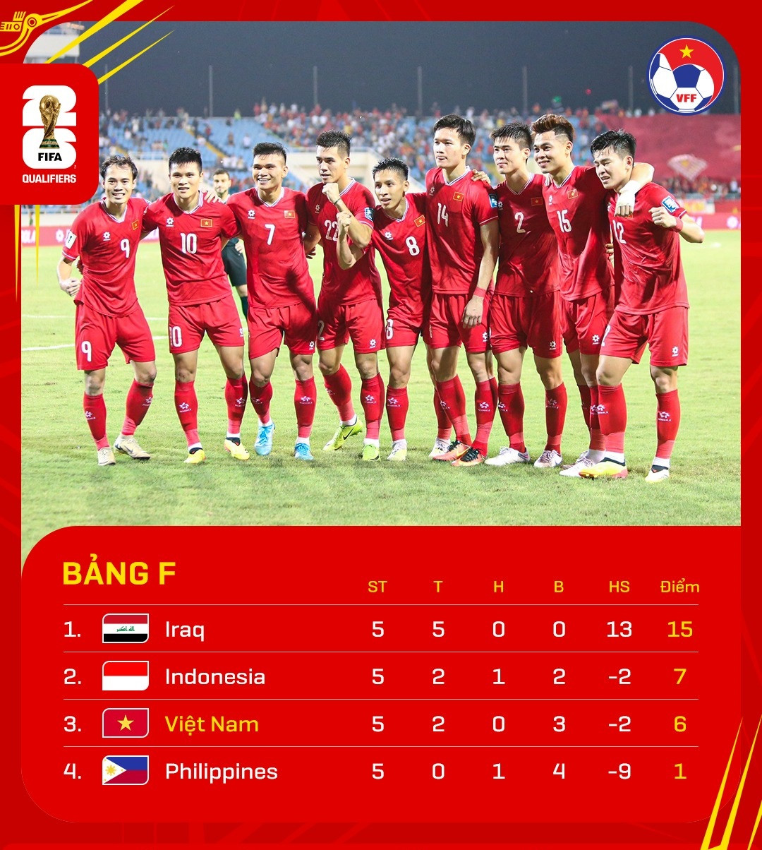 Với 3 điểm có được, tuyển Việt Nam rút ngắn khoảng cách với Indonesia ở bảng F vòng loại World Cup 2026 xuống còn 1 điểm. Đây là khoảng cách có thể san lấp ở lượt trận cuối cùng. Dù vậy, mọi chuyện không nằm trong quyền kiểm soát của tuyển Việt Nam.