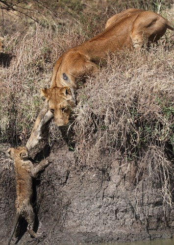 Khi đuối sức và bị trơn, tưởng như không lên được thì sư tử mẹ chìa tay ra đón.