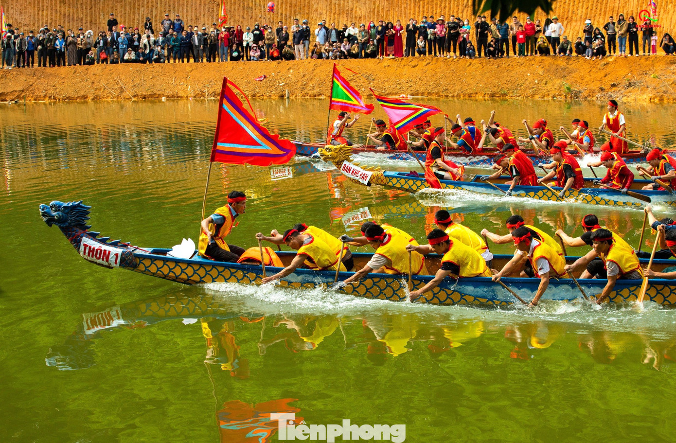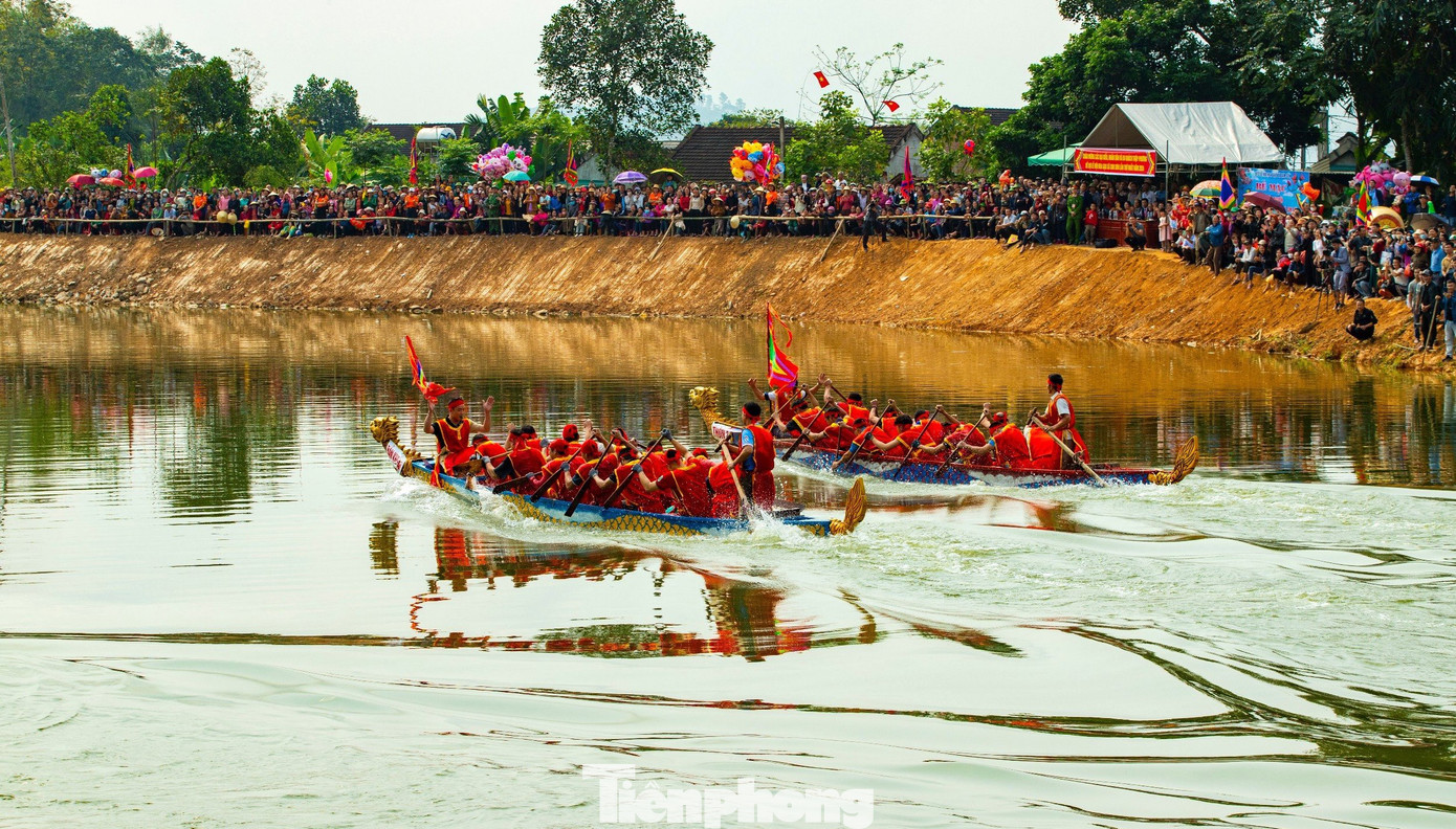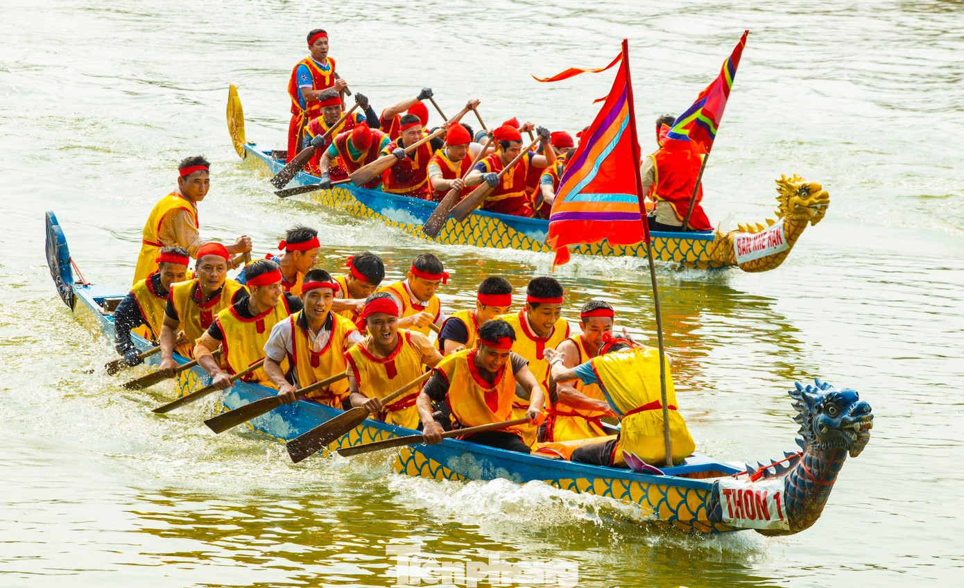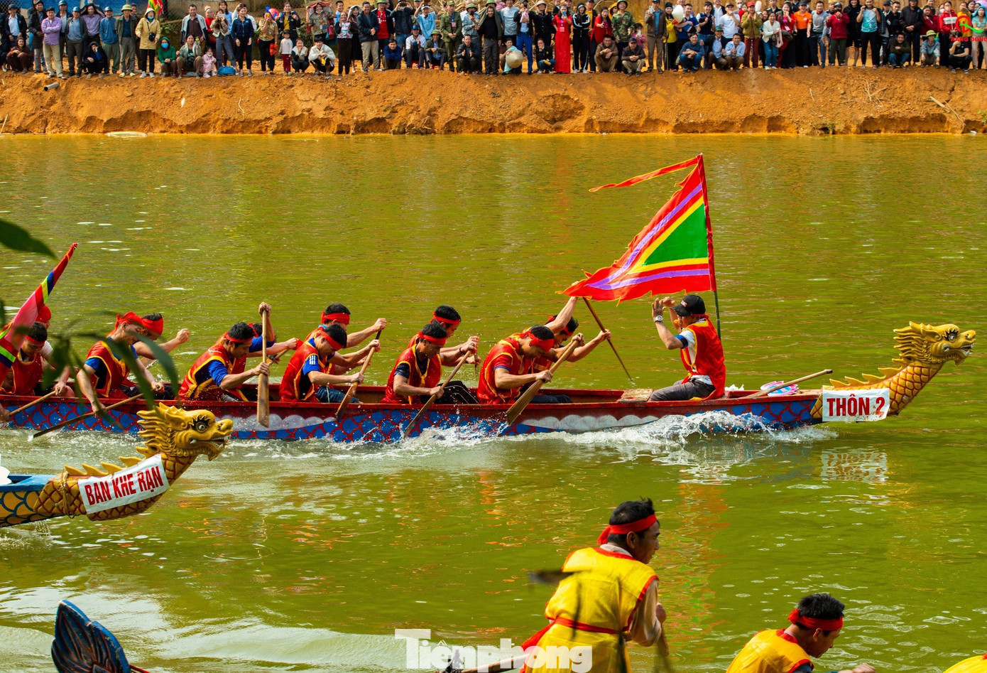 | Phần thi đấu đua thuyền tại lễ hội có sự tham gia của 6 đội thi đến từ các thôn bản trên địa bàn xã và các xã, huyện lân cận. Mỗi đội thi có 14 người đều là người có sức khỏe, kinh nghiệm sông nước. (Ảnh: Rạng Đông). |