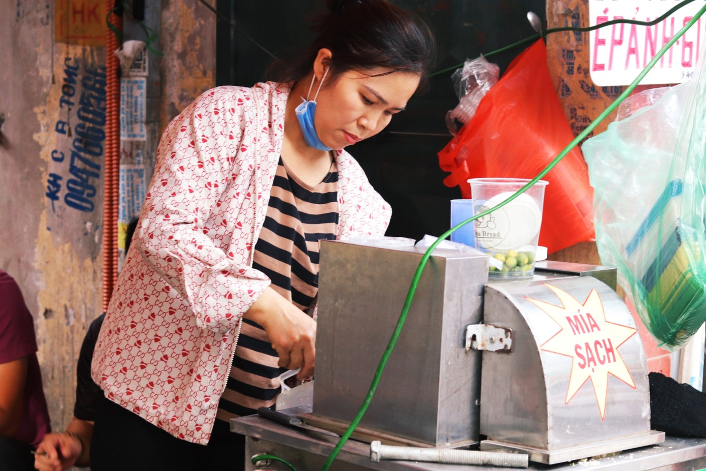 Quán nước mía của chị Phạm Thị Thành tại đường Thụy Khuê (quận Tây Hồ) luôn bận rộn vì đông khách