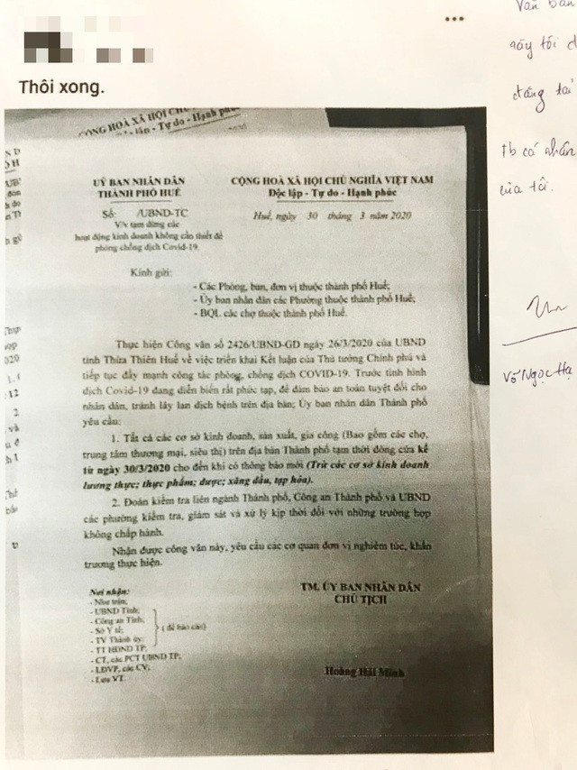 Trước đó, vào ngày 30/3, ông Trương Đình Hạnh, Phó Chủ tịch UBND TP Huế, phát văn bản về việc thông tin không đúng sự thật trên mạng xã hội. Theo đó, cũng trong ngày này, trên một số trang Facebook và nhóm chat đã đăng hình ảnh công văn ở dạng dự thảo ngày 30/3/2020 của UBND TP Huế về việc dừng các hoạt động không cần thiết (trong đó có việc đóng cửa chợ-PV) để phòng chống dịch COVID-19. Văn bản này được chia sẻ nhanh chóng trên cộng đồng mạng gây hoang mang dư luận.