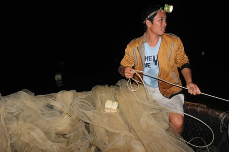 Khi đồng hồ điểm 21h30, cũng là lúc mực nước biển có dấu hiệu rút xuống, anh Hoàng và anh Phan Đông bắt đầu thu lưới lại để chờ bắt cá. Phía trên bờ đã có thương lái chờ sẵn, chỉ cần ngư dân phân loại xong là họ thu mua rồi đưa đi phân phối.