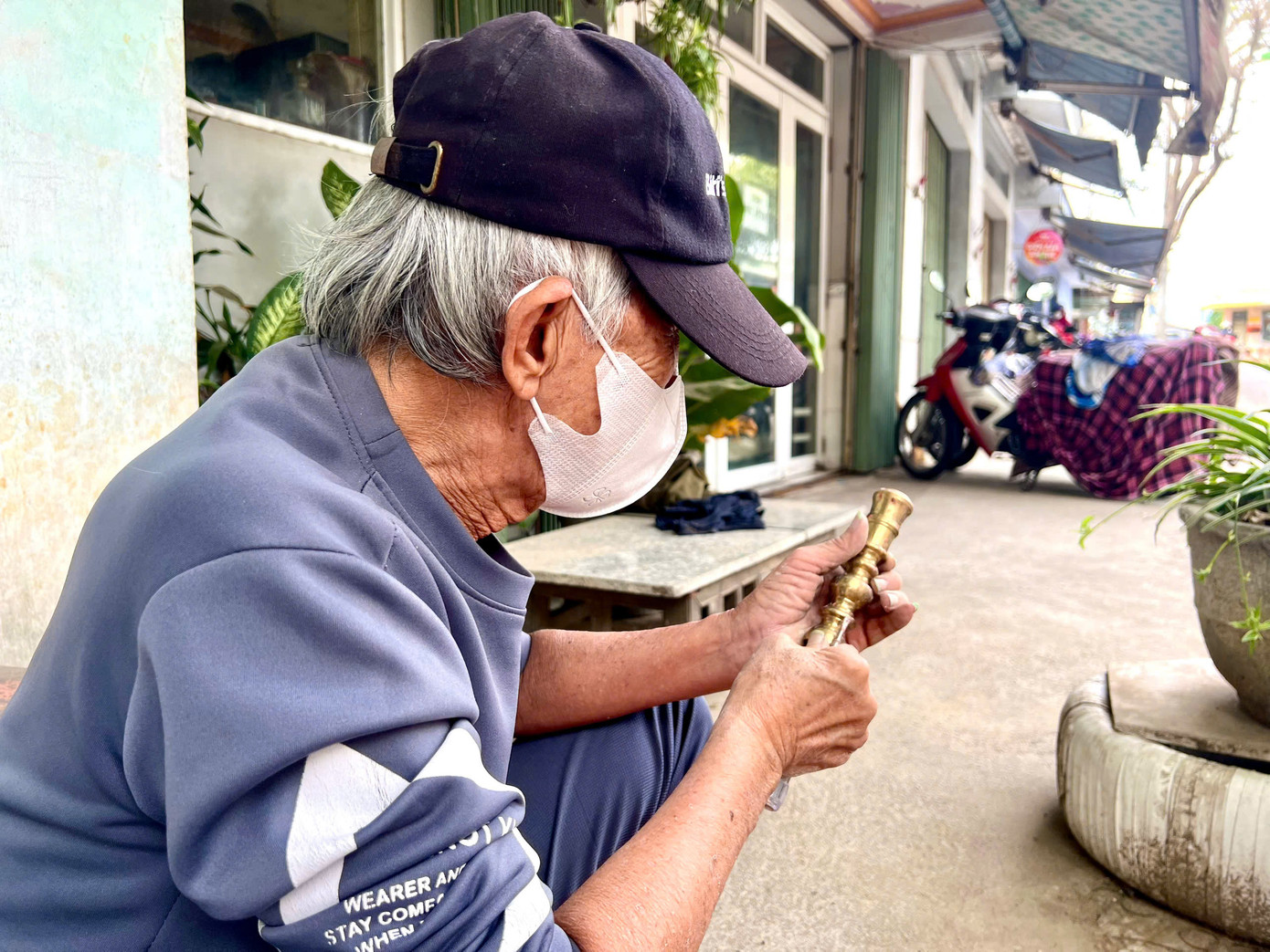 Ông Lê Tuấn Tân (phường Tân Tiến, TP Nha Trang) đã có 30 năm theo nghề đánh bóng lư đồng và công việc này ông chỉ làm mỗi năm một lần vào dịp Tết. Vì làm nghề lâu năm nên khách của ông Tân chủ yếu là khách quen. Khoảng từ đầu tháng Chạp trở đi, ông Tân mới dọn đồ nghề ra góc phố quen thuộc và nhận lư đồng của khách để làm vì ngày thường ông còn có công việc khoan cắt bê tông. Do lượng lư đồng khách mang đến rất nhiều nên ông Tân phải gọi thêm con trai hỗ trợ và ngồi làm liên tục từ sáng sớm đến chiều muộn mới kịp giao cho khách.