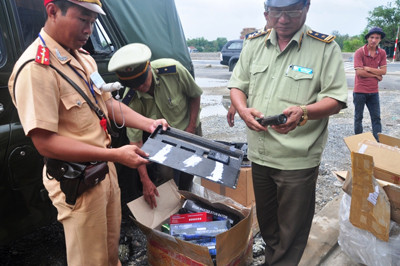Đáng nói hơn, trong số các kiện hàng này có 3 cây kiếm, 19 cây đèn pin điện, 35 cây ba-trắc, 1 súng điện, 8 roi điện. Ngoài ra, lực lượng chức năng còn phát hiện trên xe 126 điện thoại và 8 thùng hàng linh kiện điện tử nặng trên 100kg.
