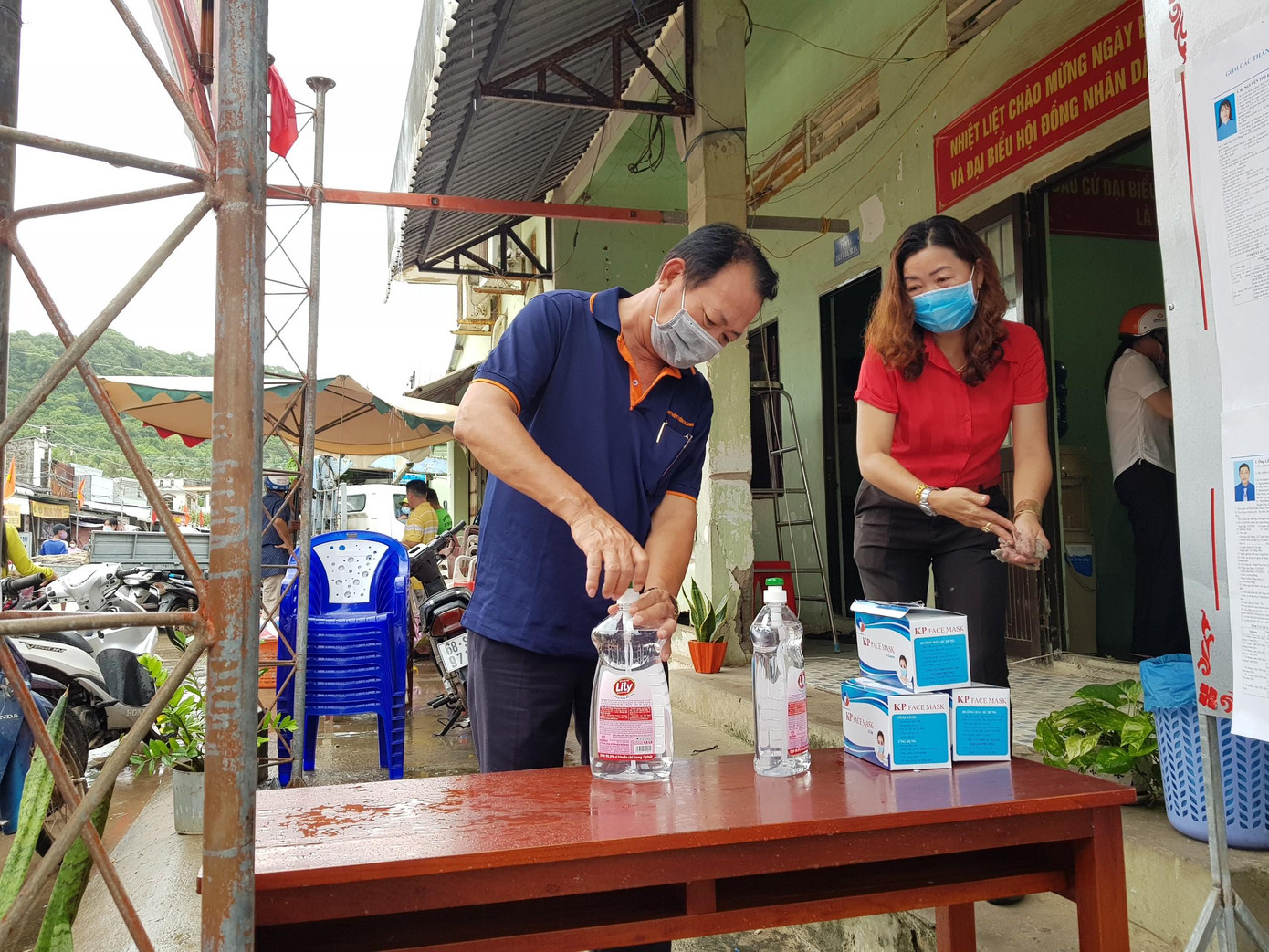 | Để phòng dịch COVID -19, khu vực bầu cử được bố trí nước khử khuẩn, khẩu trang y tế và giữ khoảng cách theo khuyến cáo 5K của Bộ Y tế. |