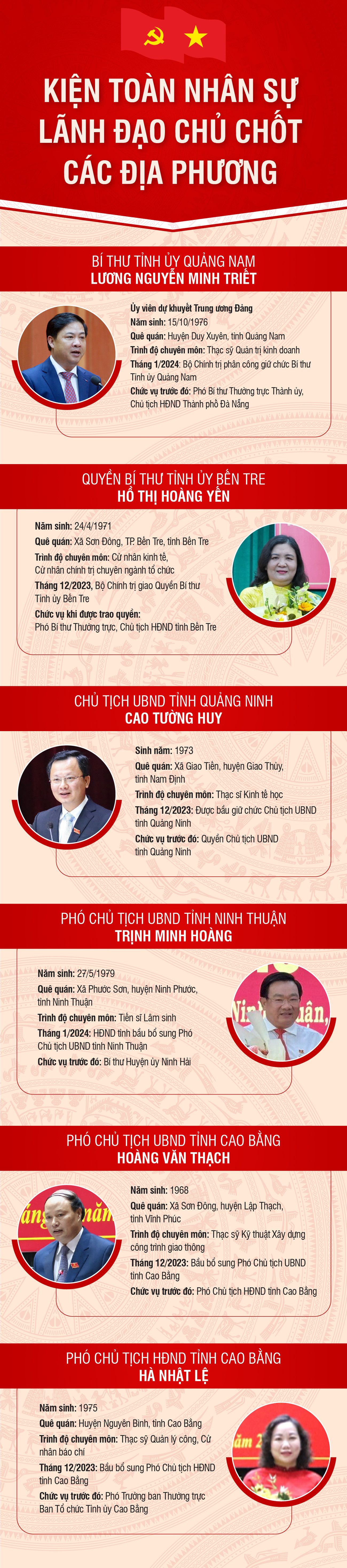 TPO - Hai tháng qua, các địa phương Bến Tre, Quảng Nam, Quảng Ninh, Ninh Thuận và Cao Bằng đã được kiện toàn nhân sự lãnh đạo chủ chốt.