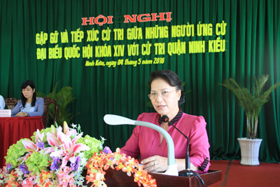 Phát biểu trước cử tri, Chủ tịch Quốc hội Nguyễn Thị Kim Ngân ghi nhận ý kiến đóng góp của cử tri. Về vấn đề biển Đông, bà Ngân cho biết Việt Nam đang kiên trì đấu tranh cùng lúc ở ba mặt trận là chính trị, ngoại giao và thực địa trên tinh thần hòa bình, tránh xảy ra xung đột. "Chúng ta phải kiên trì, kiên quyết bảo vệ từng tấc đất chủ quyền biển đảo quê hương", bà Ngân nói.