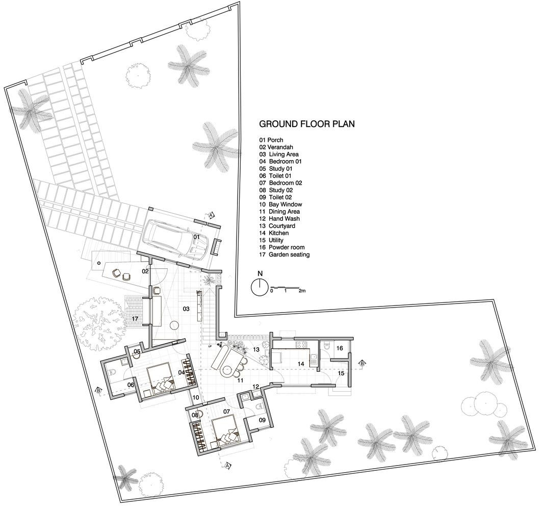 | Kiến trúc đặc biệt này được xây dựng trên mảnh đất có diện tích 630m2 hình chữ L, bao quanh một cây đa ở phía Tây của khu đất. |
