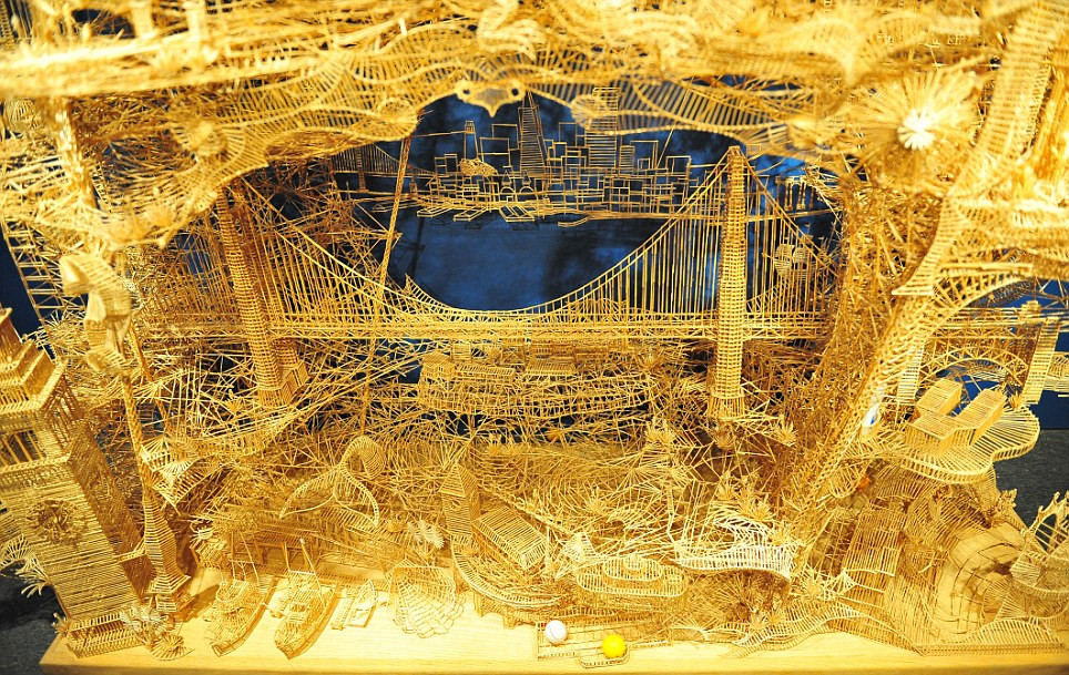 Được làm từ 100.000 chiếc tăm trong suốt 3000 giờ, tác phẩm Rolling Through the Bay (Cuốn qua vịnh) mô phỏng hình ảnh vịnh San Fransisco (Mỹ) chân thực dưới con mắt của Weaver.