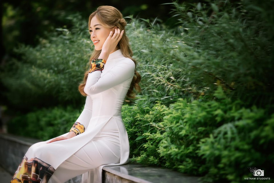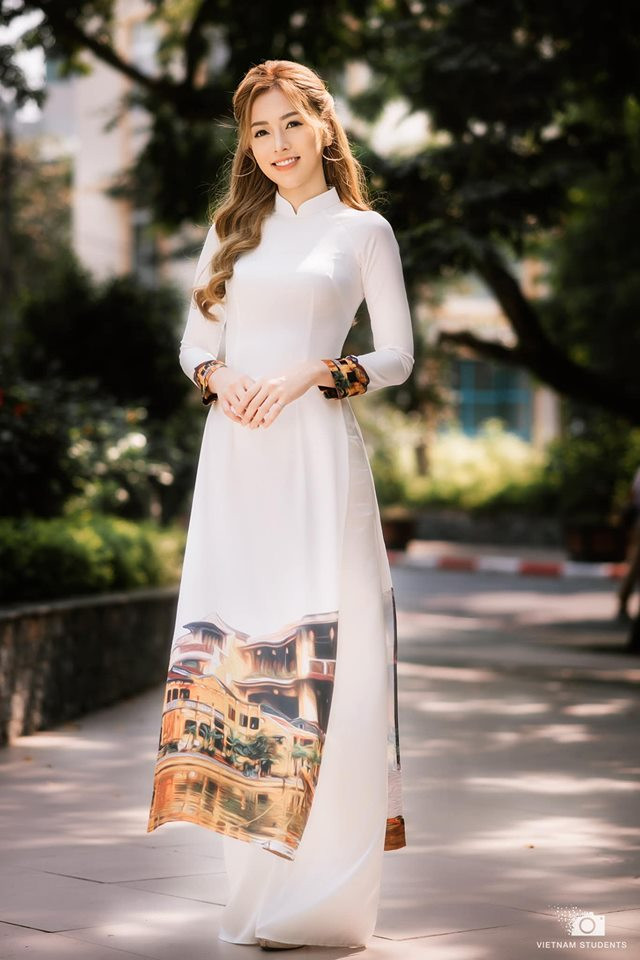 Á hậu Phương Nga xinh đẹp, thướt tha trong tà áo dài do Hoa hậu Ngọc Hân thiết kế.