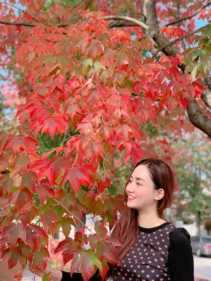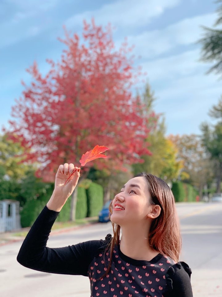 Người đẹp thích thú tạo dáng chụp ảnh với cây lá đỏ đặc trưng của Canada.