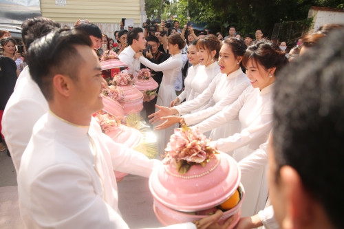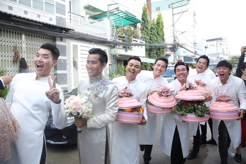 Dàn bưng quả là những người bạn thân của cô dâu chú rể, trong đó có Trương Nam Thành (trái).