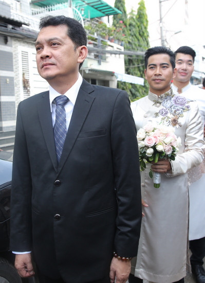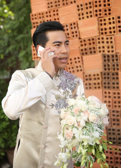Chú rể Thanh Bình bận rộn với những cuộc điện thoại chúc mừng từ bạn bè hai bên.
